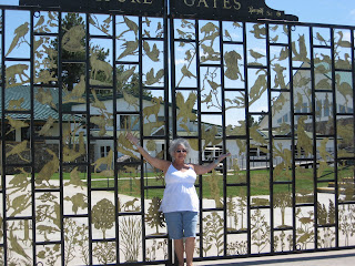 This will eventually be a complex of great size. When leaving there are gates of the native animals and here is a picture of them with my mother in law, Eileen. These are all polished brass coloured and very impressive.