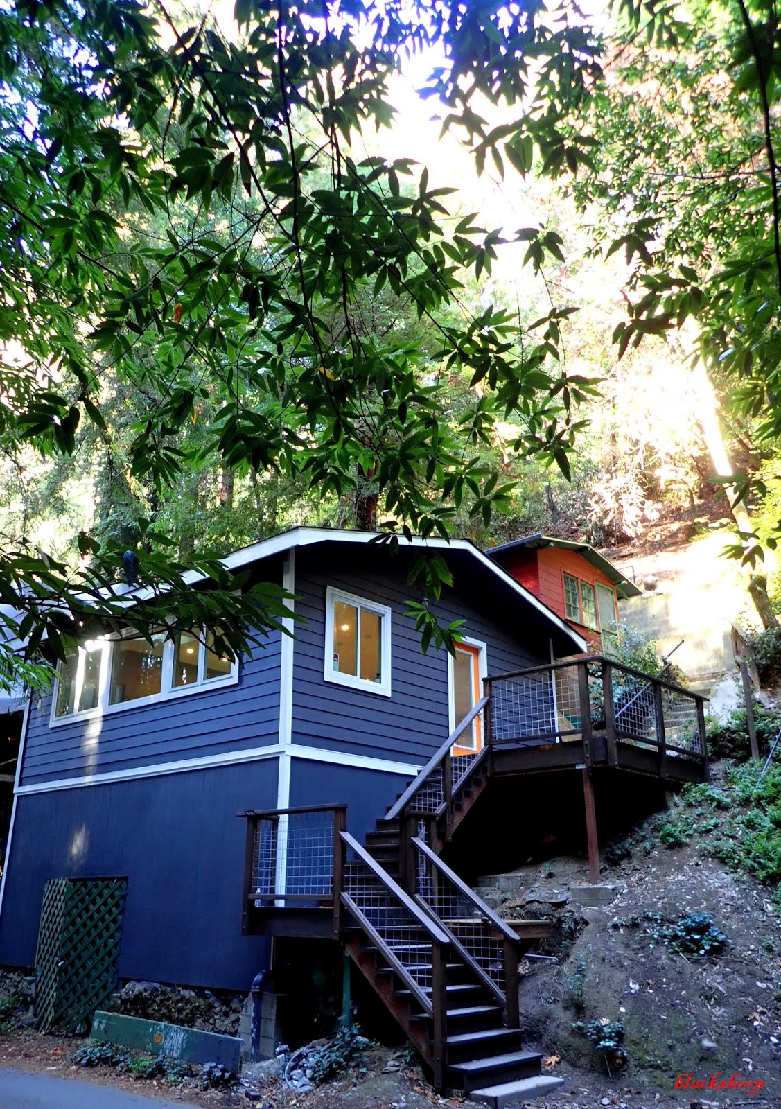 ... looking out the windows towards the canyon and creek into all the redwood trees...